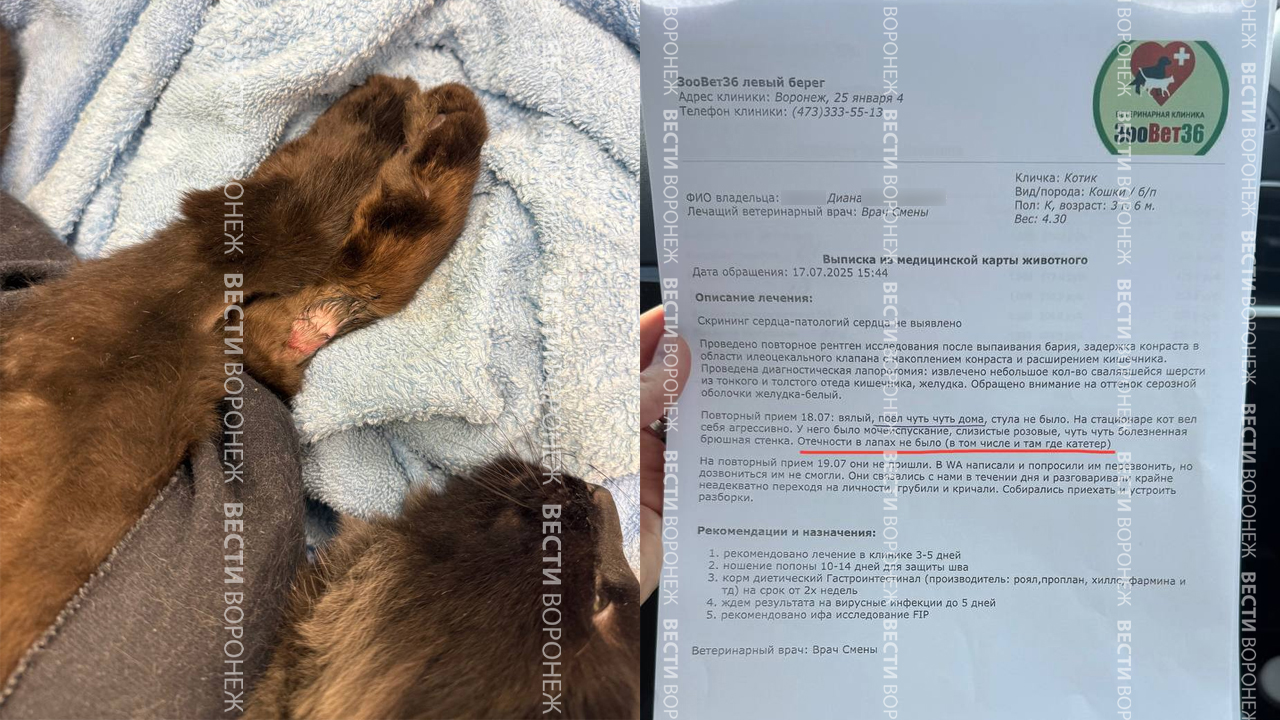 Диана вместе с котом снова поехала в клинику. Оказалось, что катетер был перетянут, но врачи отметили, что такое бывает – в этом нет ничего серьёзного. Однако позже оказалось, что ветеринары из «Зоовет36» якобы неправильно поставили катетер – мимо вены.